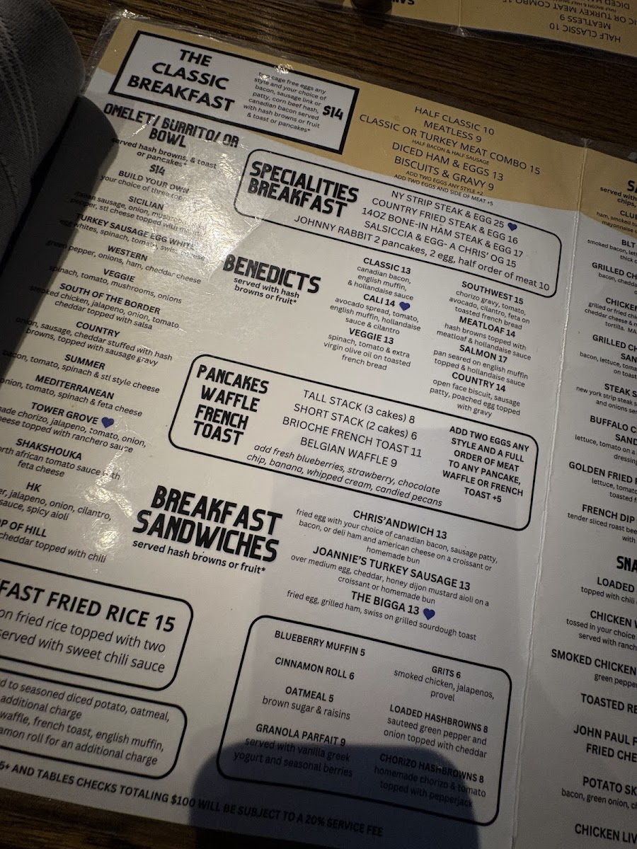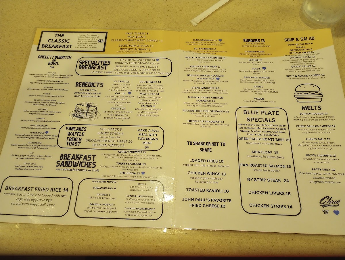 The menu features an impressive selection of breakfast favorites, with options to suit every taste. If you're in the mood for something sweet, their signature pancakes, served with syrup or fruit toppings, will definitely hit the spot. For those who prefer something savory, there are plenty of options that will leave you full and satisfied. And let's not forget their sides - crispy hashbrowns, buttery toast, and more are perfect complements to any meal. Whether you're a regular or it's your first visit, there's always something new to try, making every trip to Chris' a delicious experience.